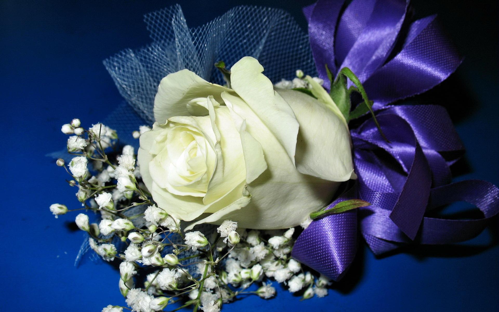 Wallpaper White rose with gypsophila bandaged with purple ribbon