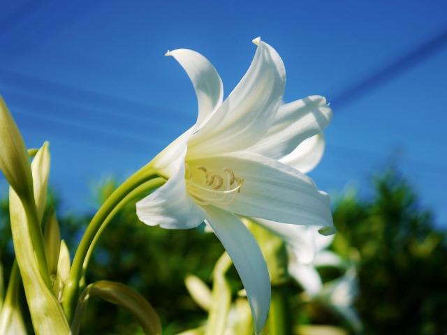 Wallpaper Snow-white lily under a beautiful blue sky close-up