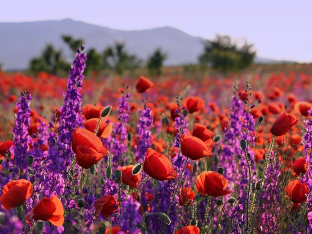 Wallpaper Purple wildflowers and red poppies in the sun in the field