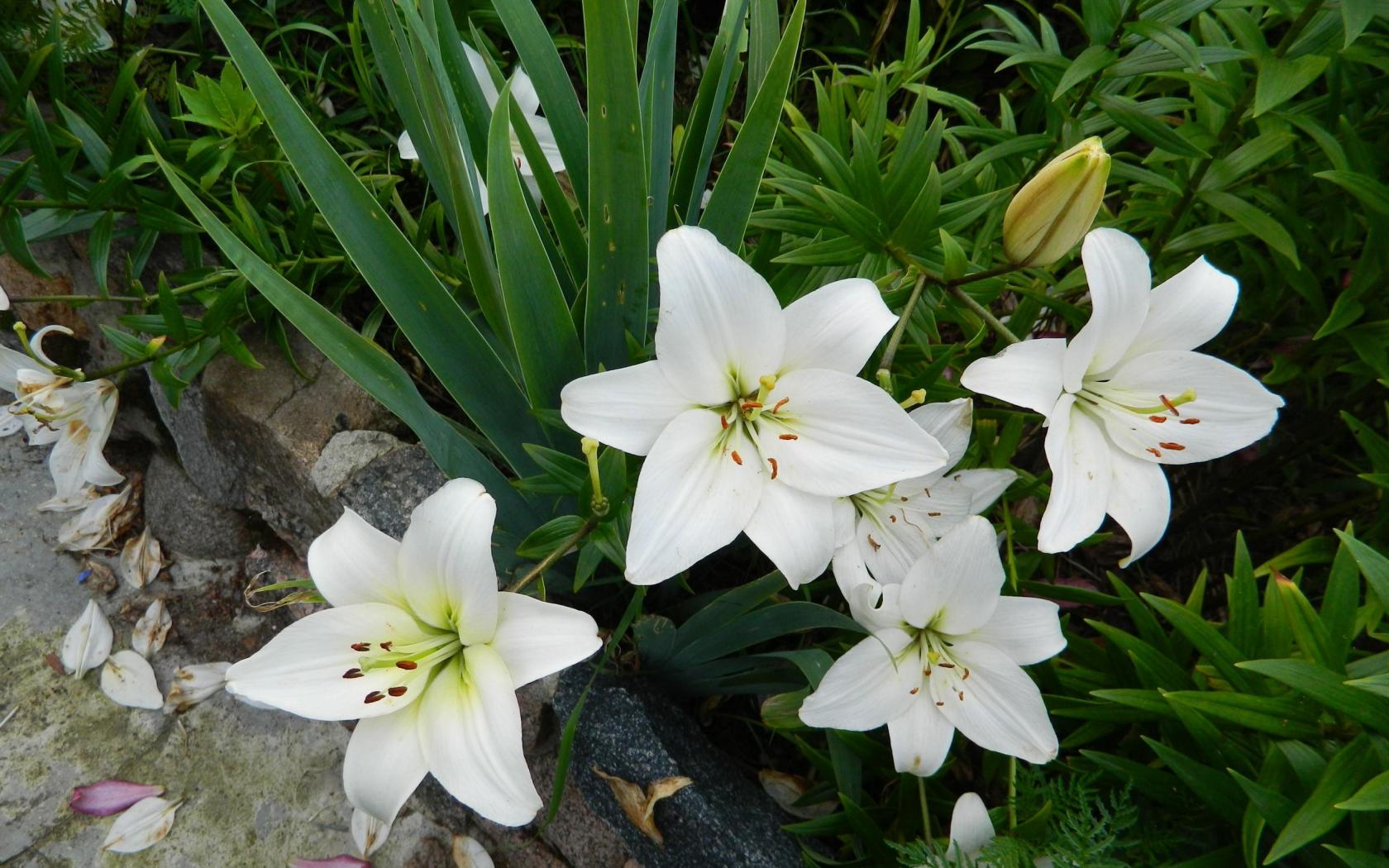 Wallpaper Beautiful white lilies with buds on a flower bed with flowers