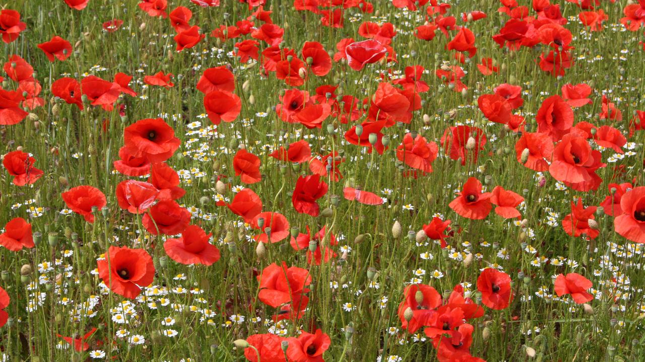 Wallpaper Field of red poppies with white daisies