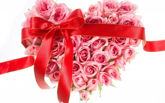 Wallpaper Heart of pink roses with a red ribbon on a white background