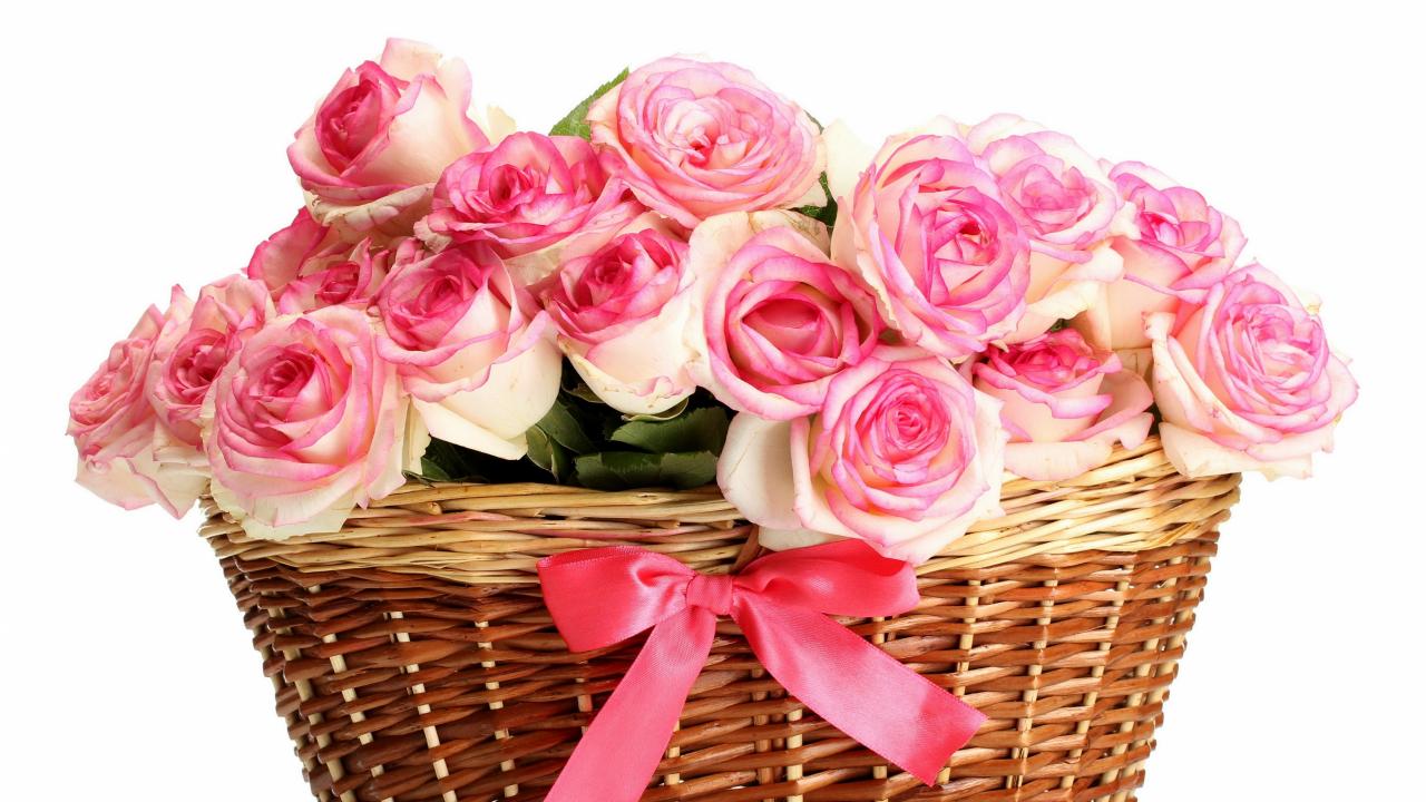 Wallpaper Bouquet of pink roses in a basket on a white background