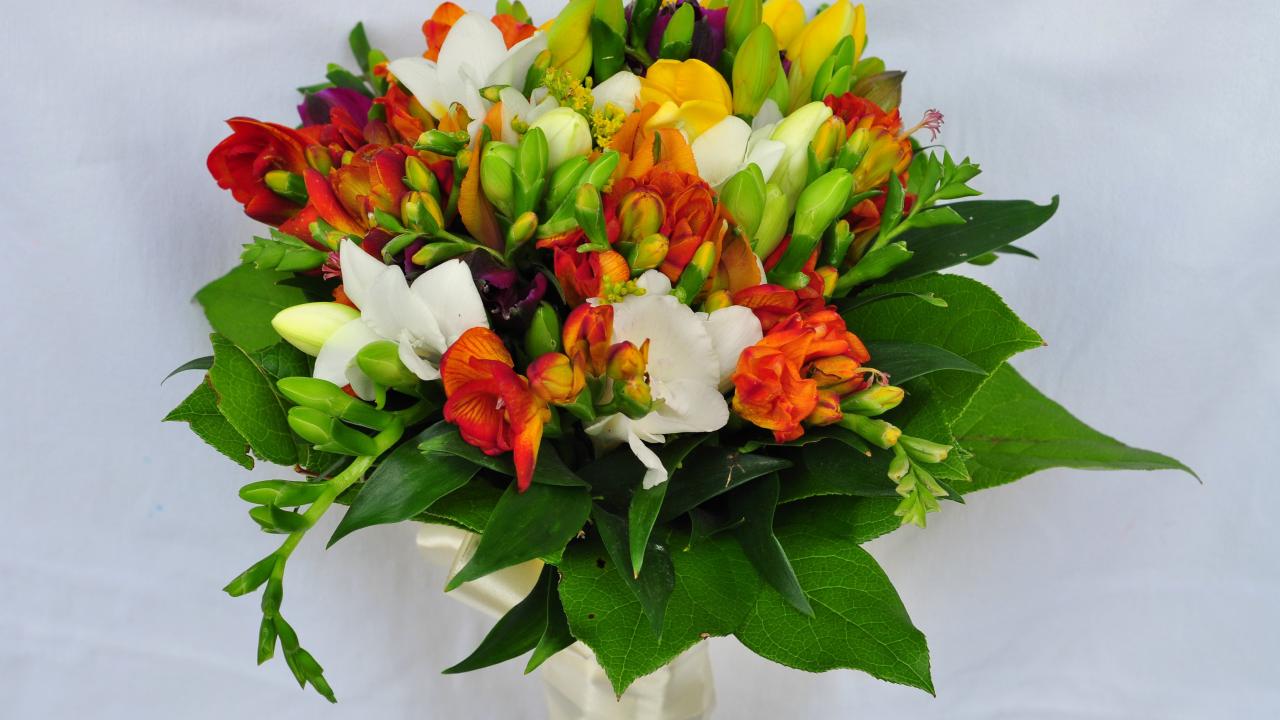 Wallpaper Beautiful bouquet of freesias on a gray background