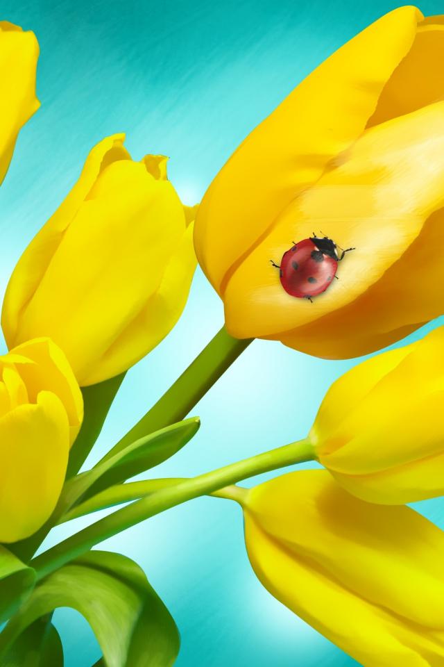 Wallpaper Bouquet of yellow tulips with ladybug on blue background