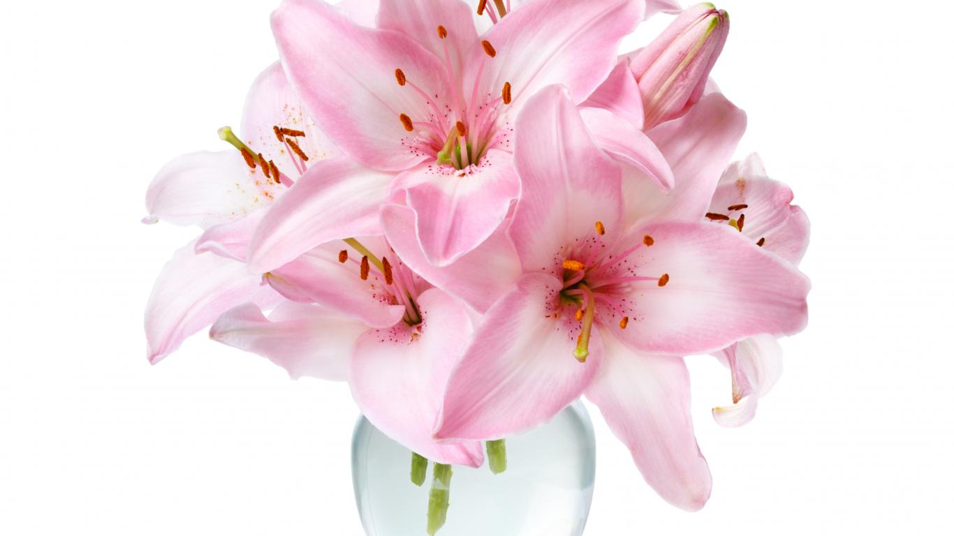 Wallpaper Bouquet of tender pink lilies in a glass vase on a white background