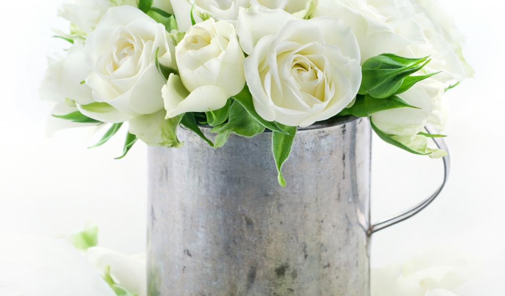 Wallpaper Bouquet of white roses in an iron mug on a white background