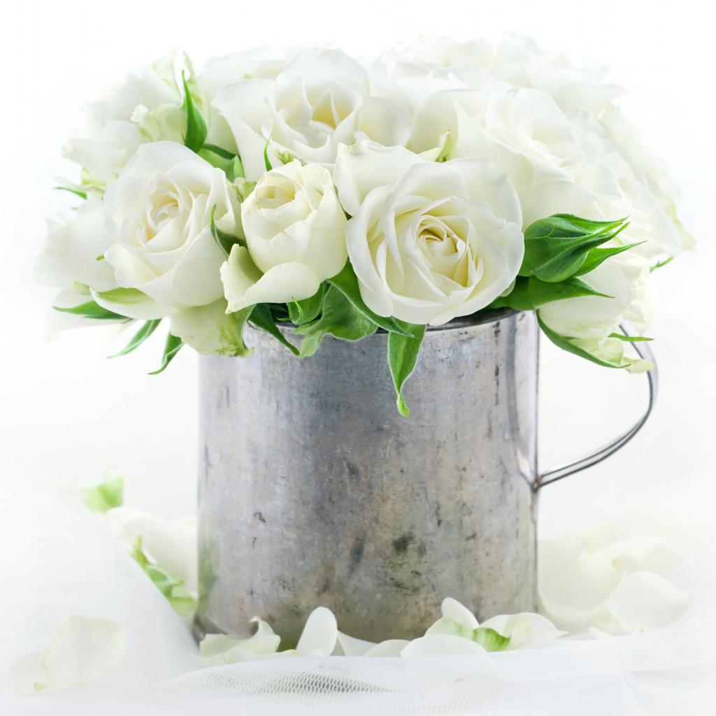 » Wallpaper Bouquet of white roses in an iron mug on a white background