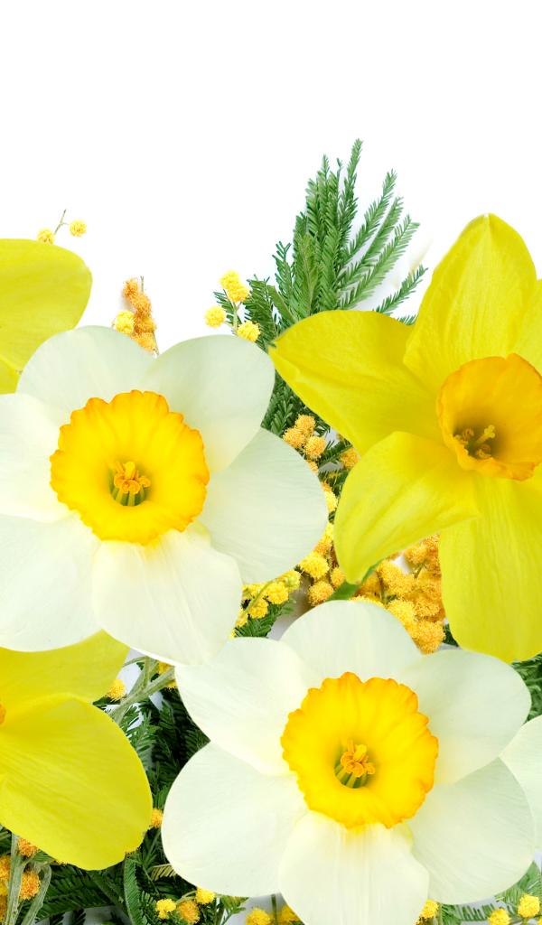 Wallpaper White and yellow daffodils with mimosa on a white background