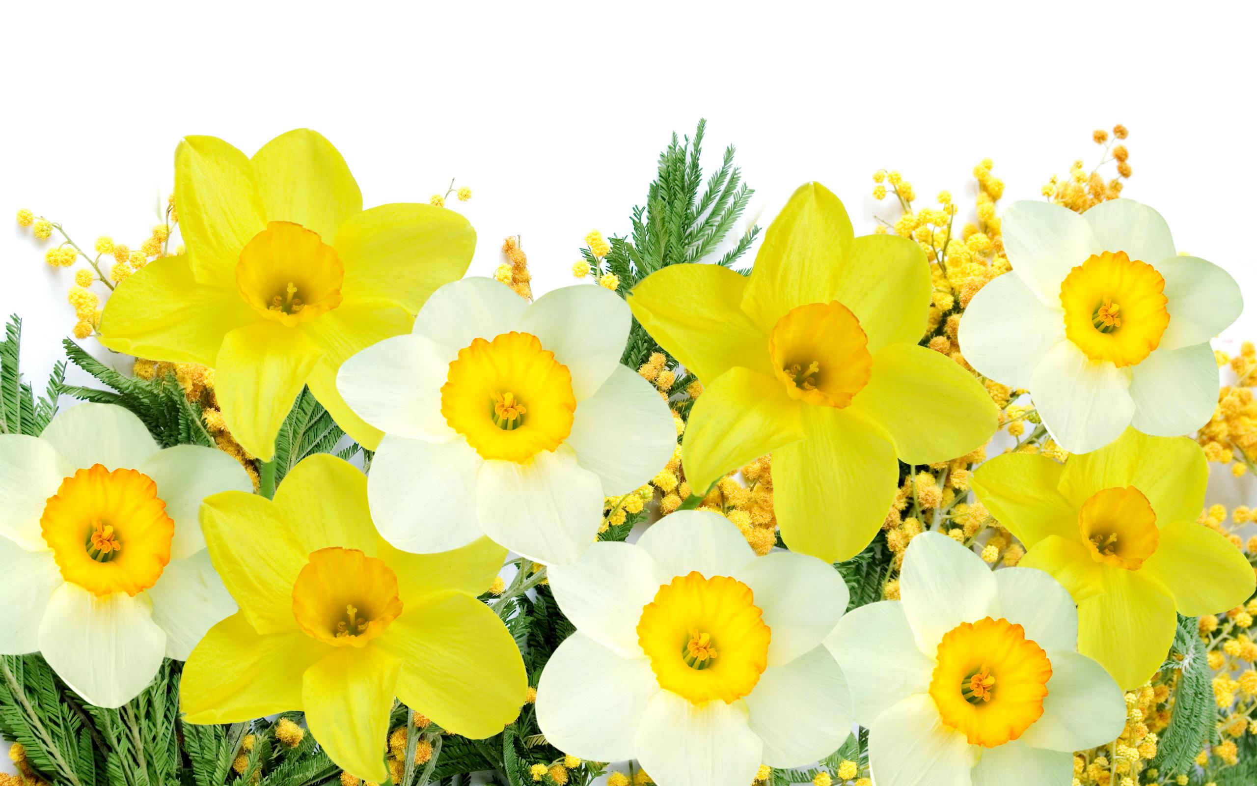 Wallpaper White and yellow daffodils with mimosa on a white background