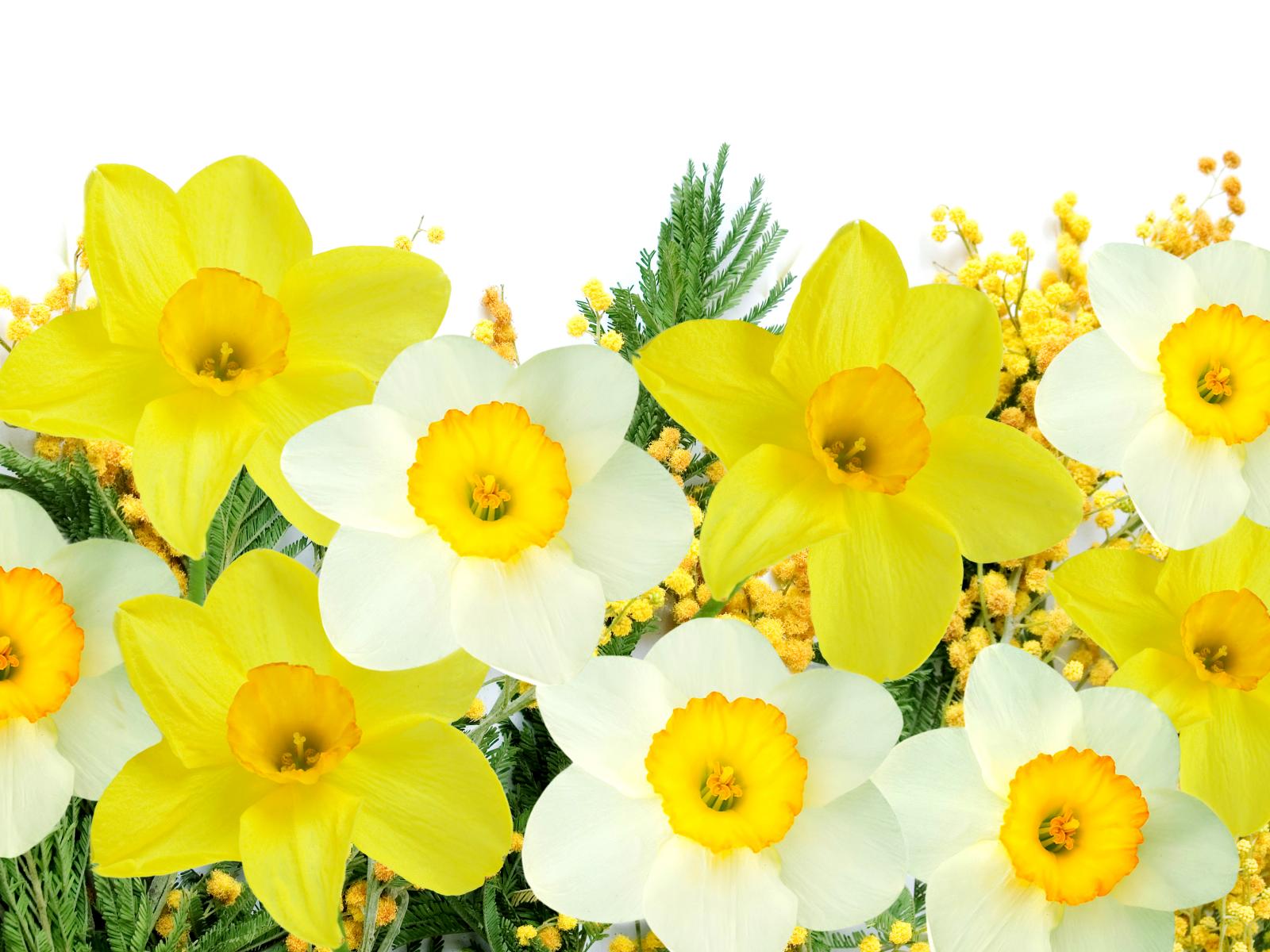 Wallpaper White and yellow daffodils with mimosa on a white background