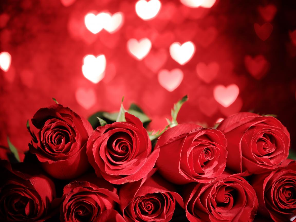 Wallpaper A bouquet of large red roses on the background of hearts
