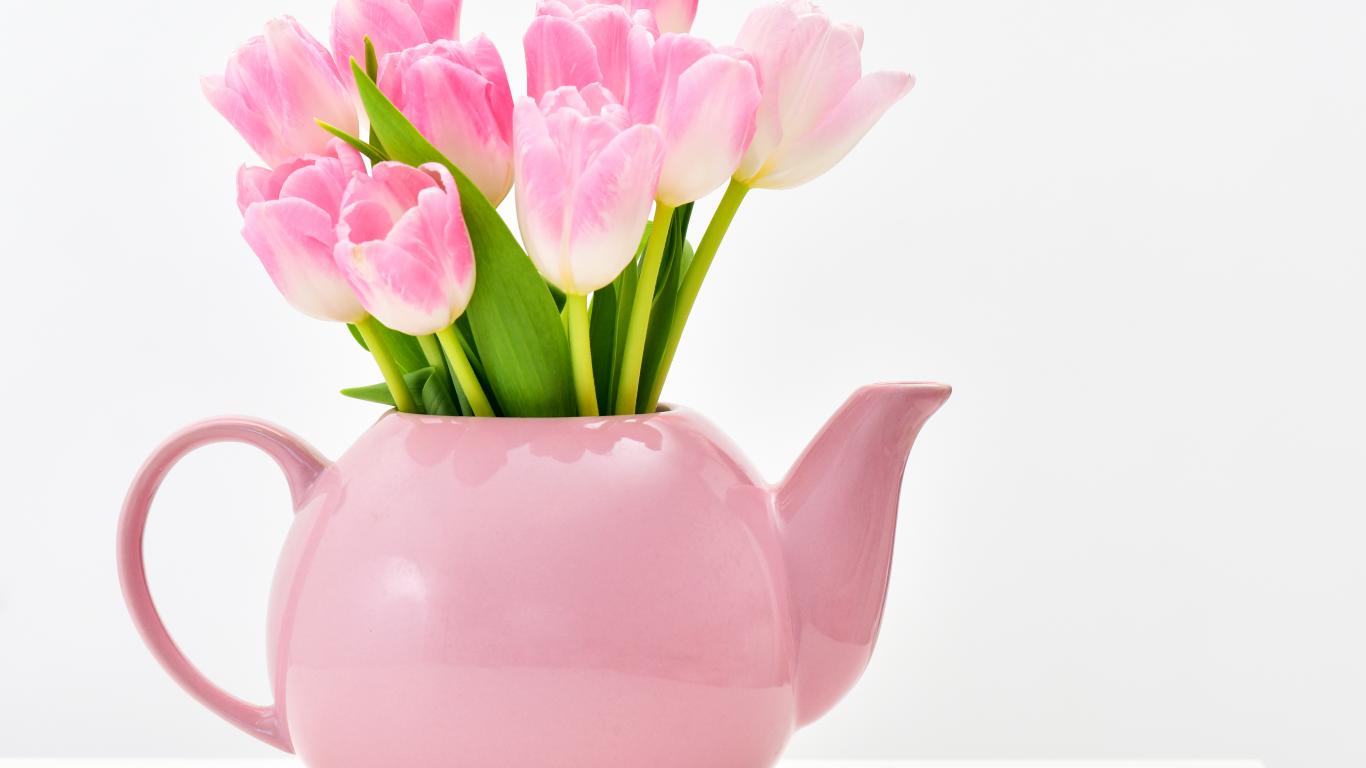 Wallpaper Pink tulips in a teapot on a white background
