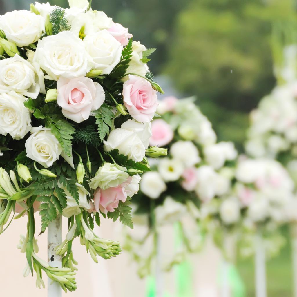 Wallpaper Beautiful wedding bouquets of roses and freesia in decor