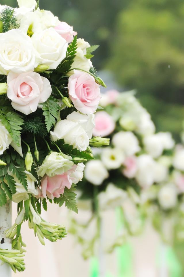 Wallpaper Beautiful wedding bouquets of roses and freesia in decor