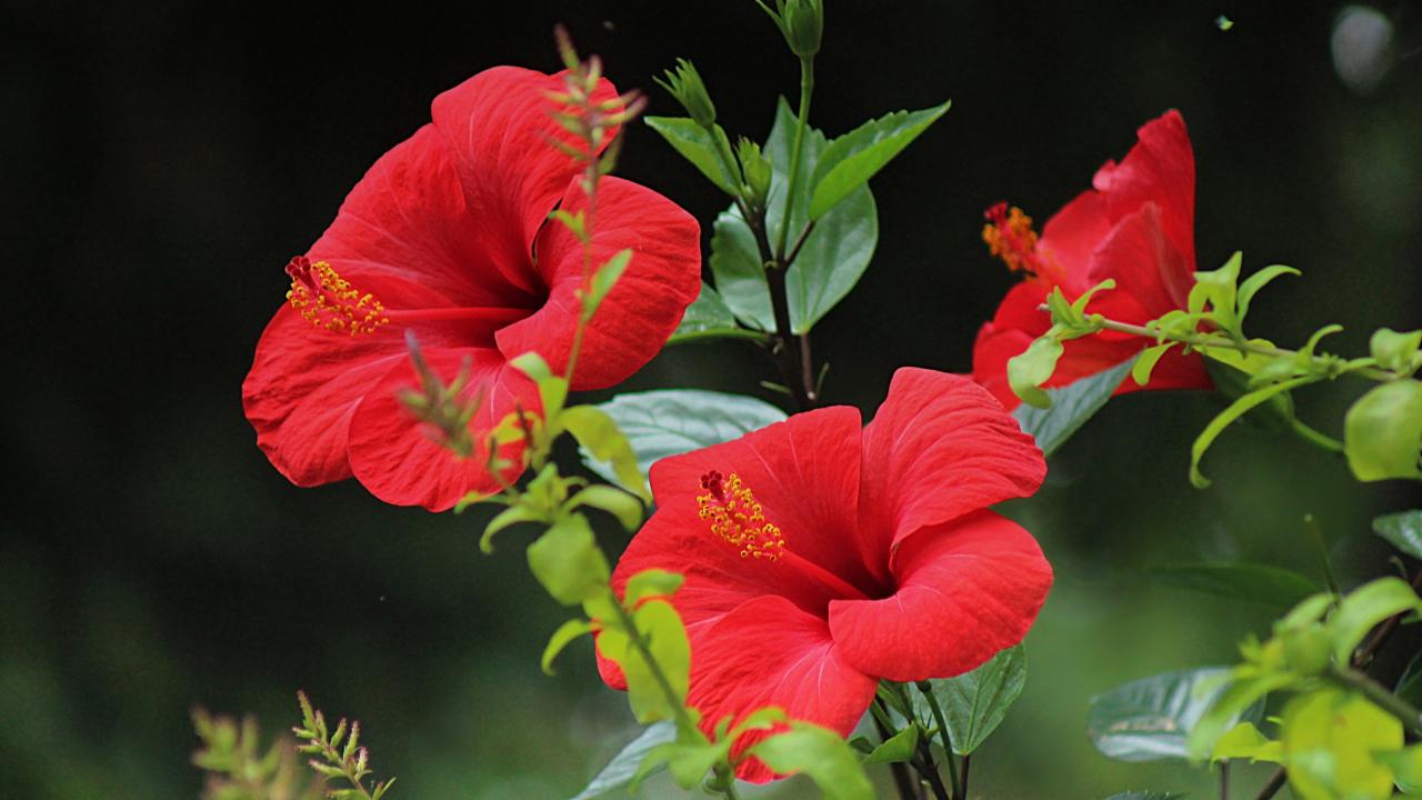 Wallpaper Beautiful red hibiscus flowers with green leaves