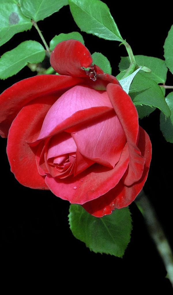 Wallpaper Beautiful red rose with green leaves on a black background