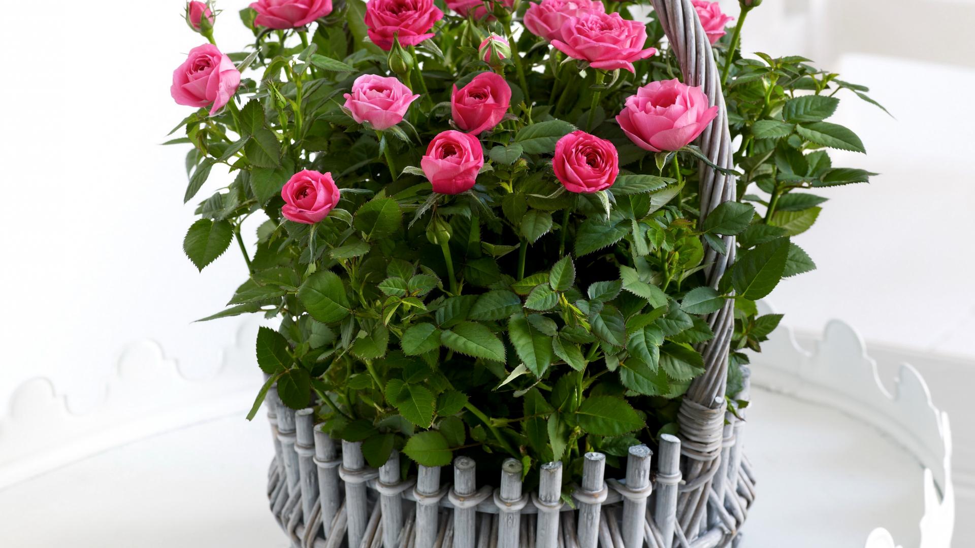 Wallpaper Bouquet of pink roses in a gray basket on a white background