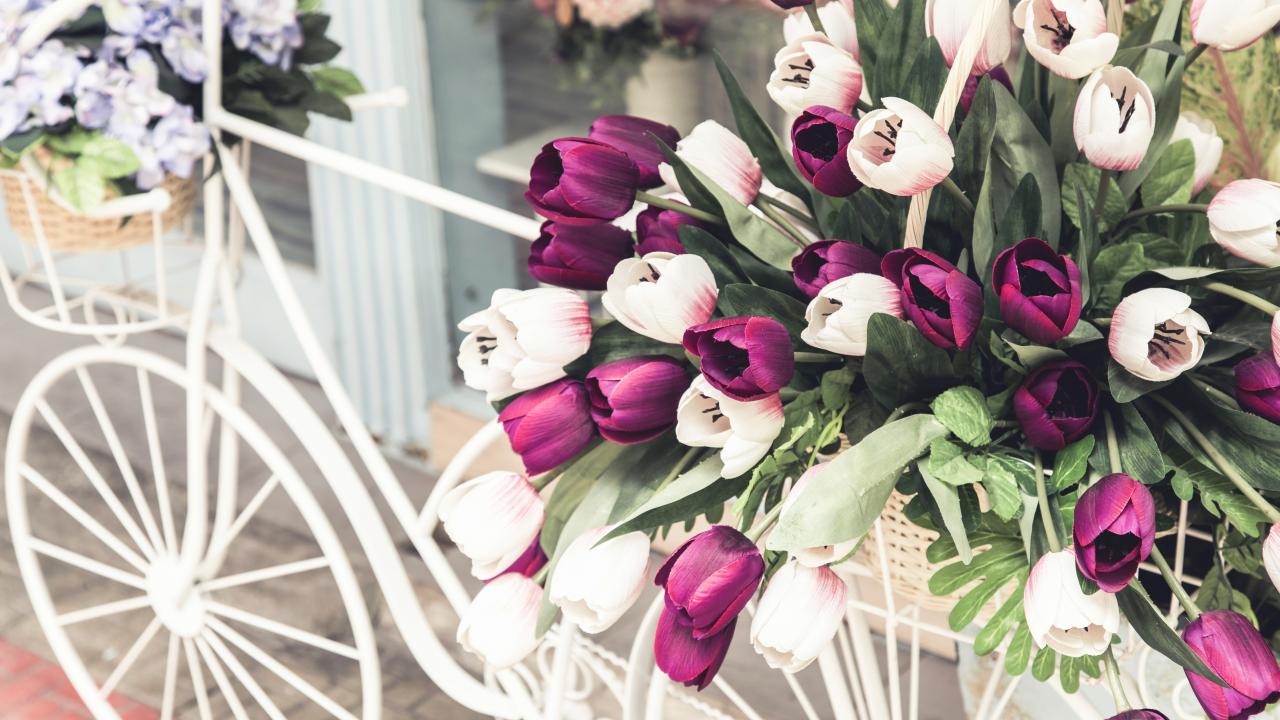 Wallpaper Bouquet of tulips in a basket on a white bicycle