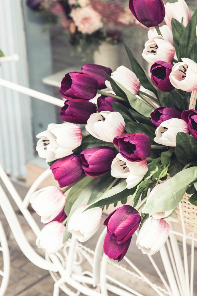 Wallpaper Bouquet of tulips in a basket on a white bicycle