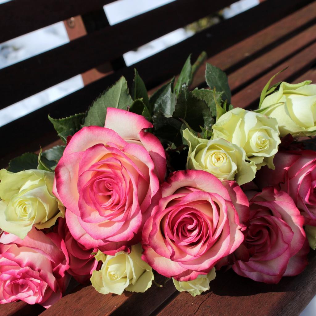 Wallpaper A bouquet of pink and white roses lies on a bench in the park