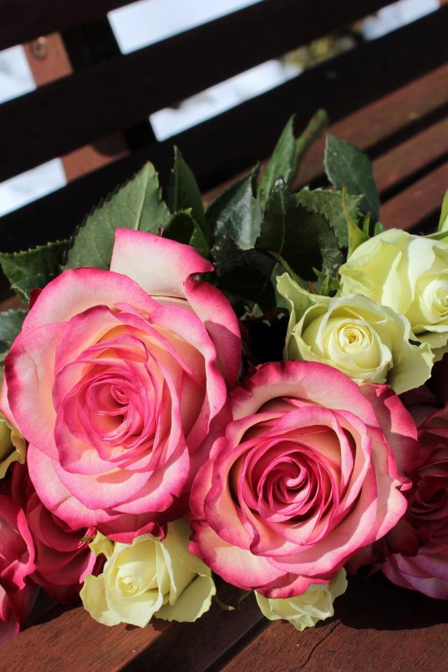 Wallpaper A bouquet of pink and white roses lies on a bench in the park
