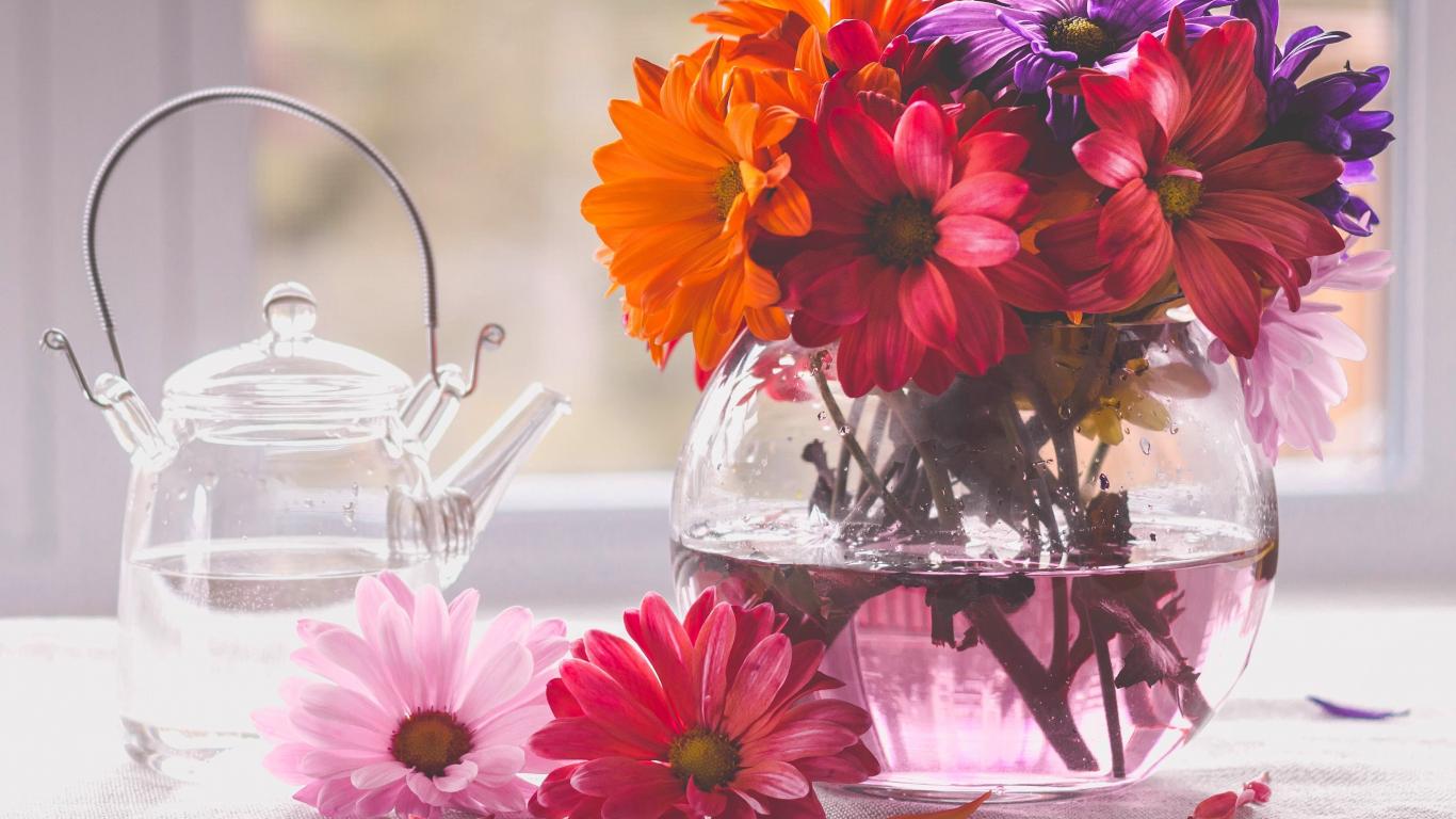 Wallpaper A bouquet of flowers in a glass vase on a table