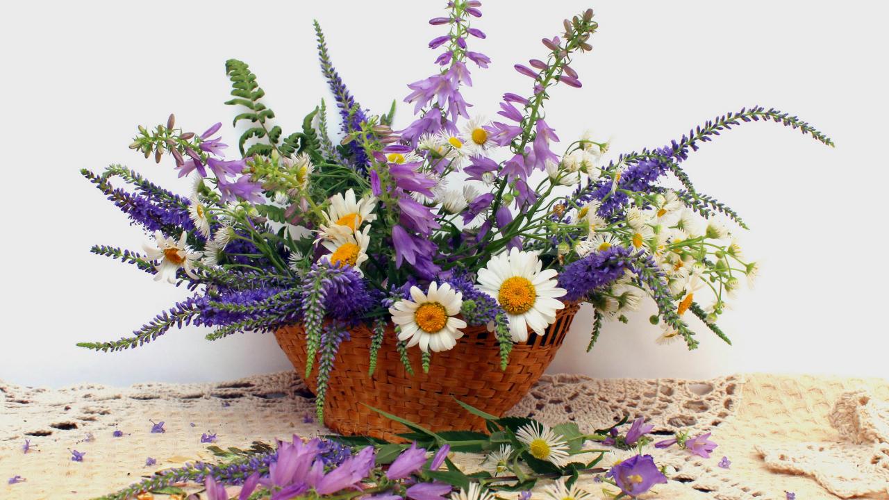 Wallpaper Basket of beautiful wildflowers on a gray background