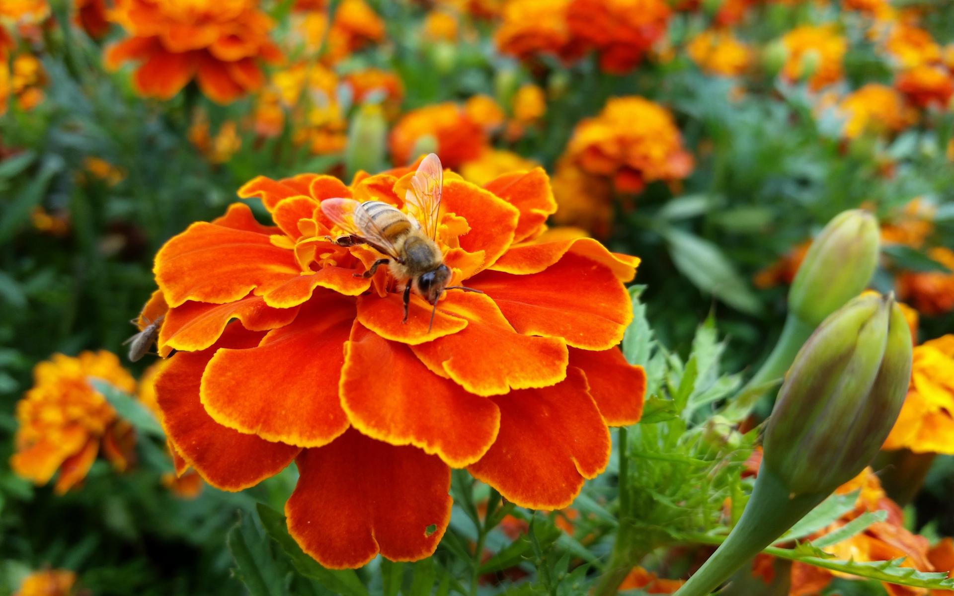 Wallpaper The wasps sits on a beautiful orange flower marigold