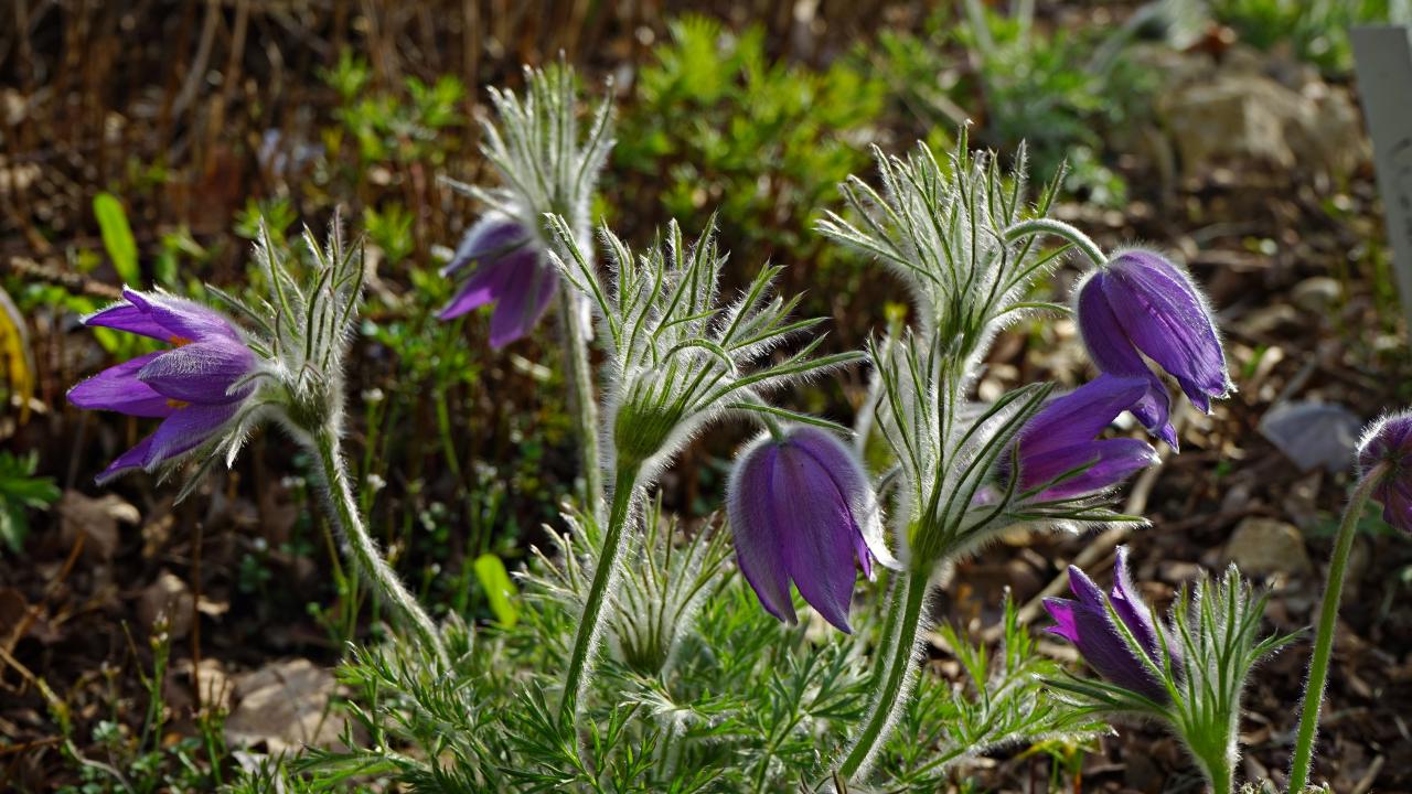 Wallpaper Purple flowers lumbago in the sun close up