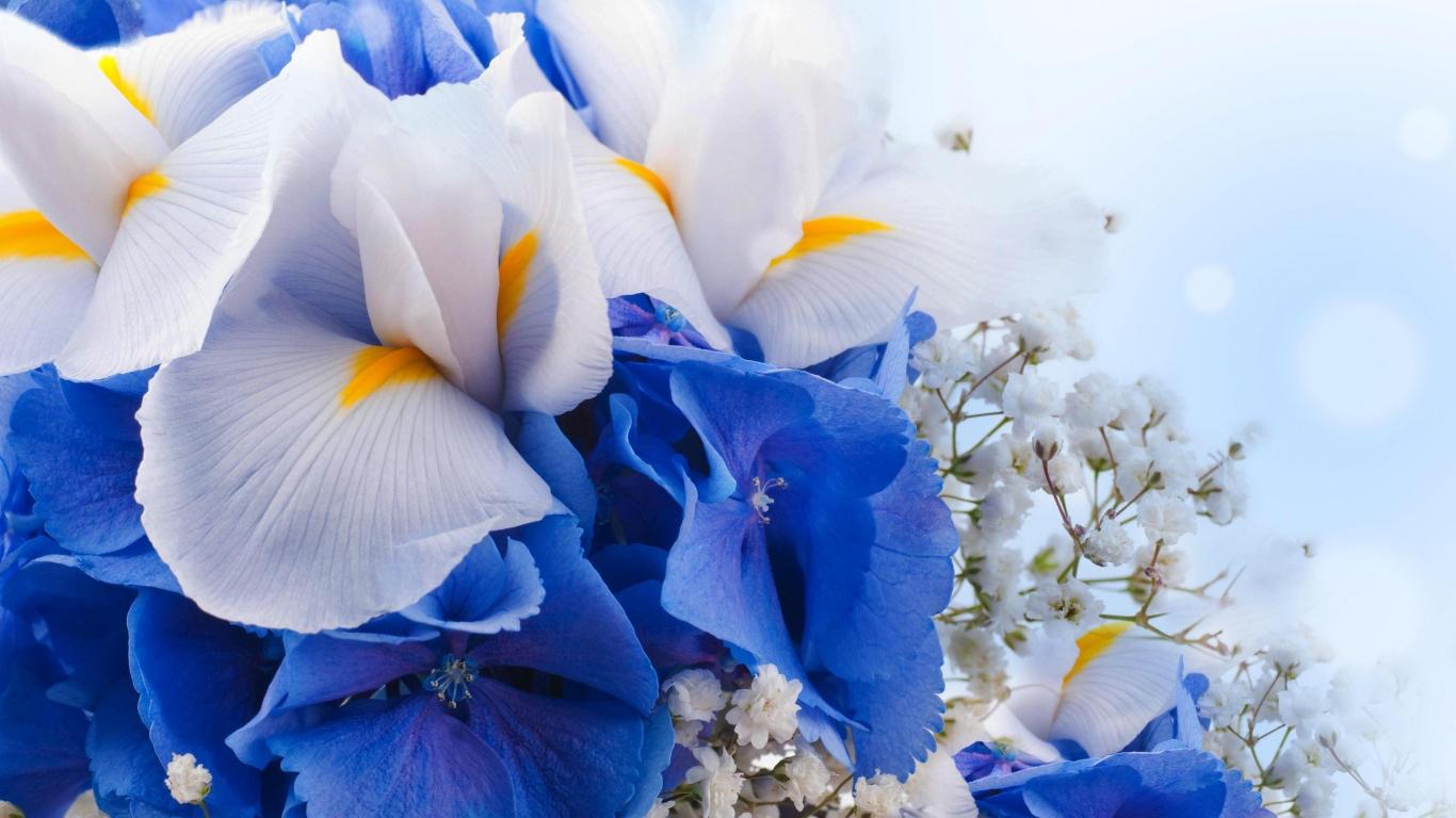 Wallpaper Flowers of iris, hydrangeas and gypsophila close-up