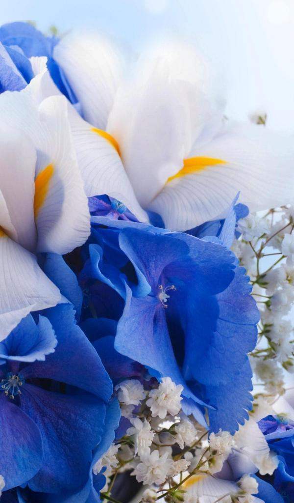 Wallpaper Flowers of iris, hydrangeas and gypsophila close-up