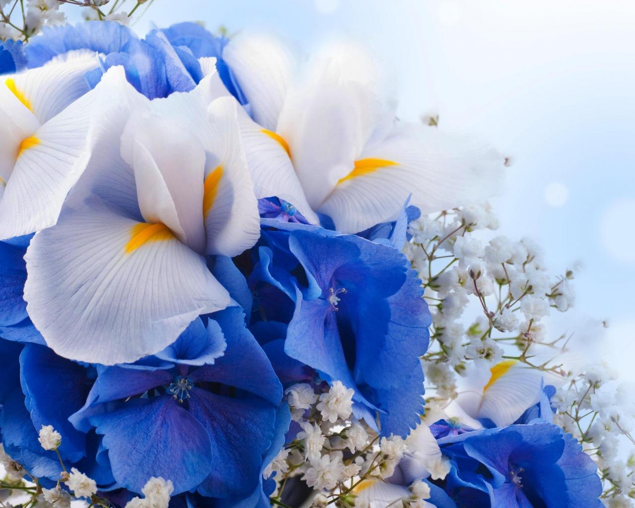Wallpaper Flowers of iris, hydrangeas and gypsophila close-up