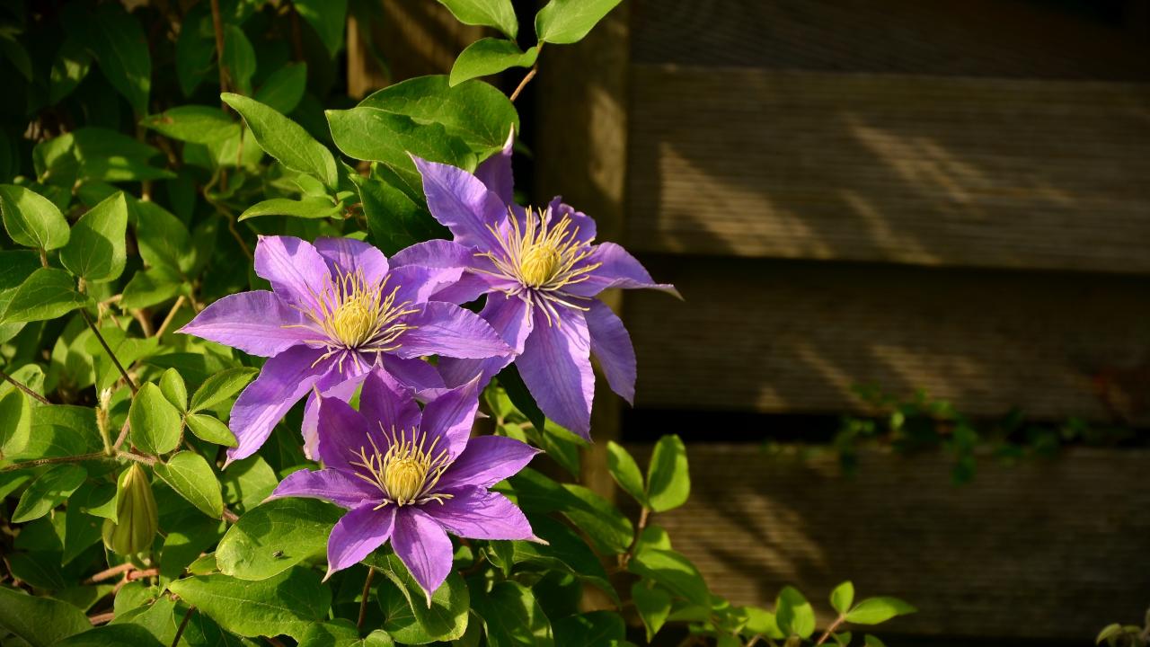 Wallpaper Three purple Clematis flowers with green leaves in the sun