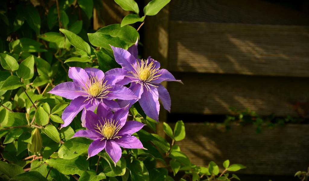 Wallpaper Three purple Clematis flowers with green leaves in the sun