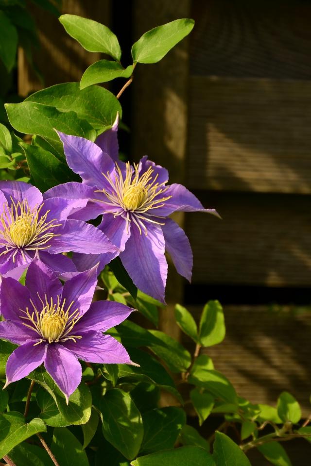 Wallpaper Three purple Clematis flowers with green leaves in the sun