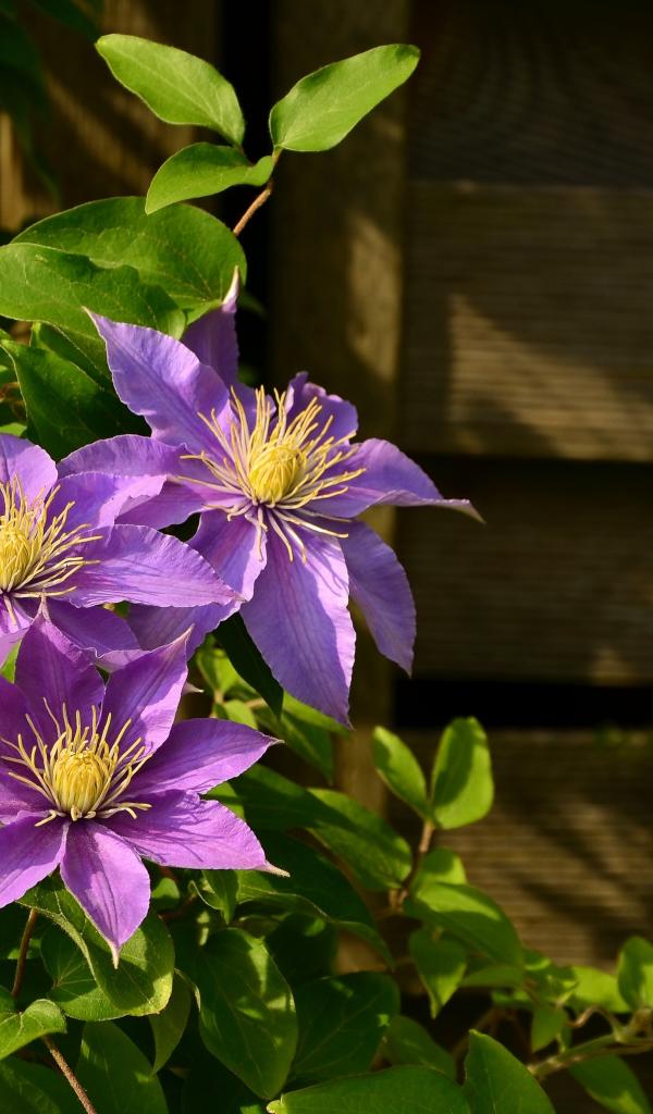 Wallpaper Three purple Clematis flowers with green leaves in the sun