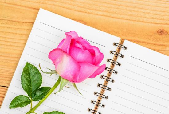 Wallpaper A beautiful pink rose lies on a notepad on the table