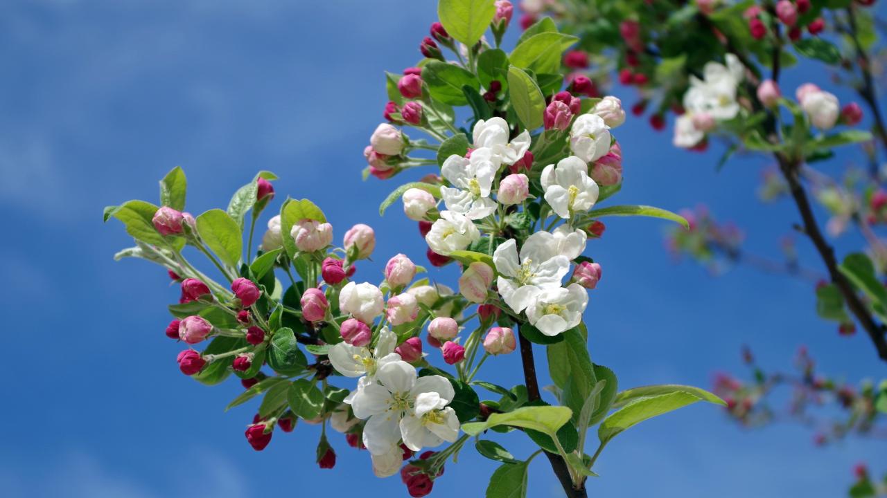 Wallpaper Flowering lush apple tree branch against the blue sky in the spring
