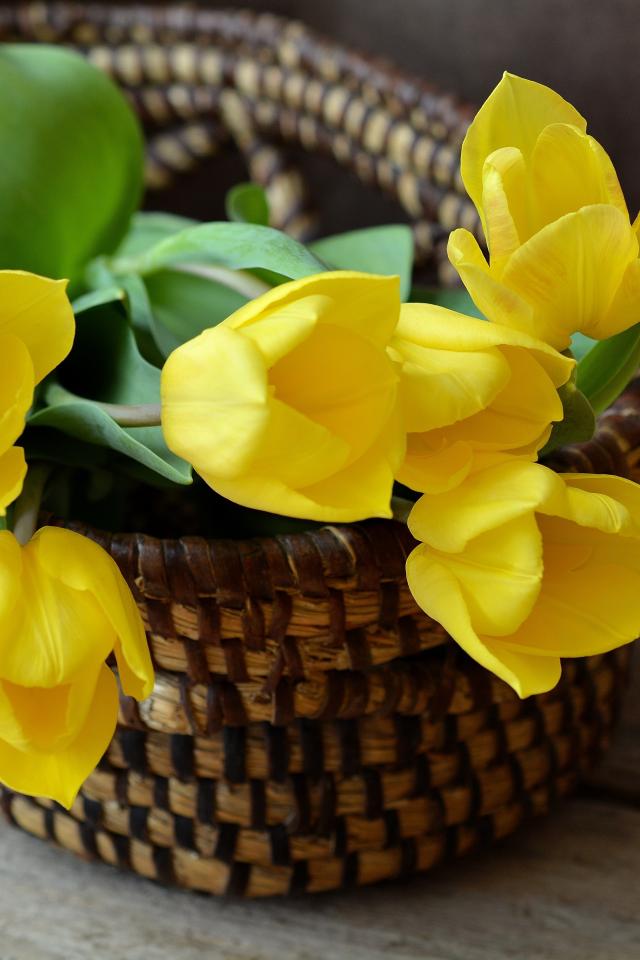 Wallpaper A bouquet of yellow tulips in a basket
