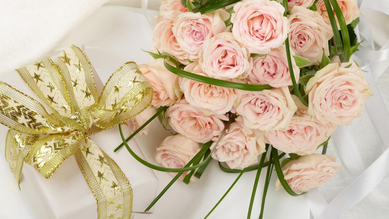 Wallpaper Bouquet of pink roses and a gift with a beautiful bow