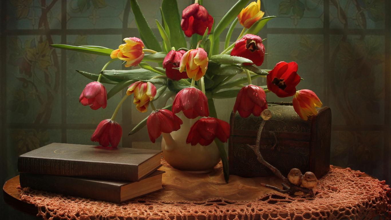 » Wallpaper A bouquet of tulips on a table with books and a box