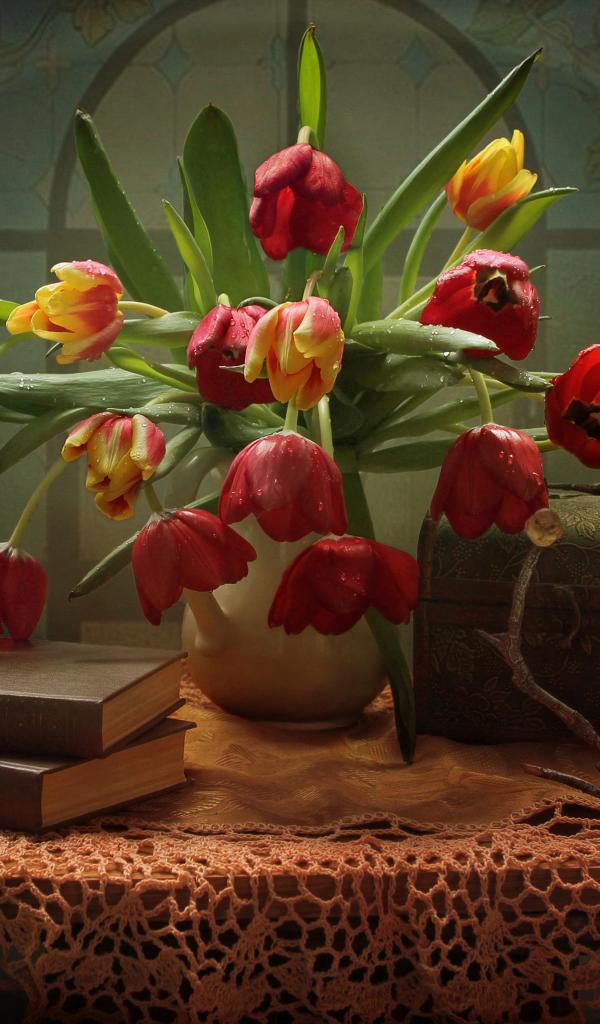 » Wallpaper A bouquet of tulips on a table with books and a box