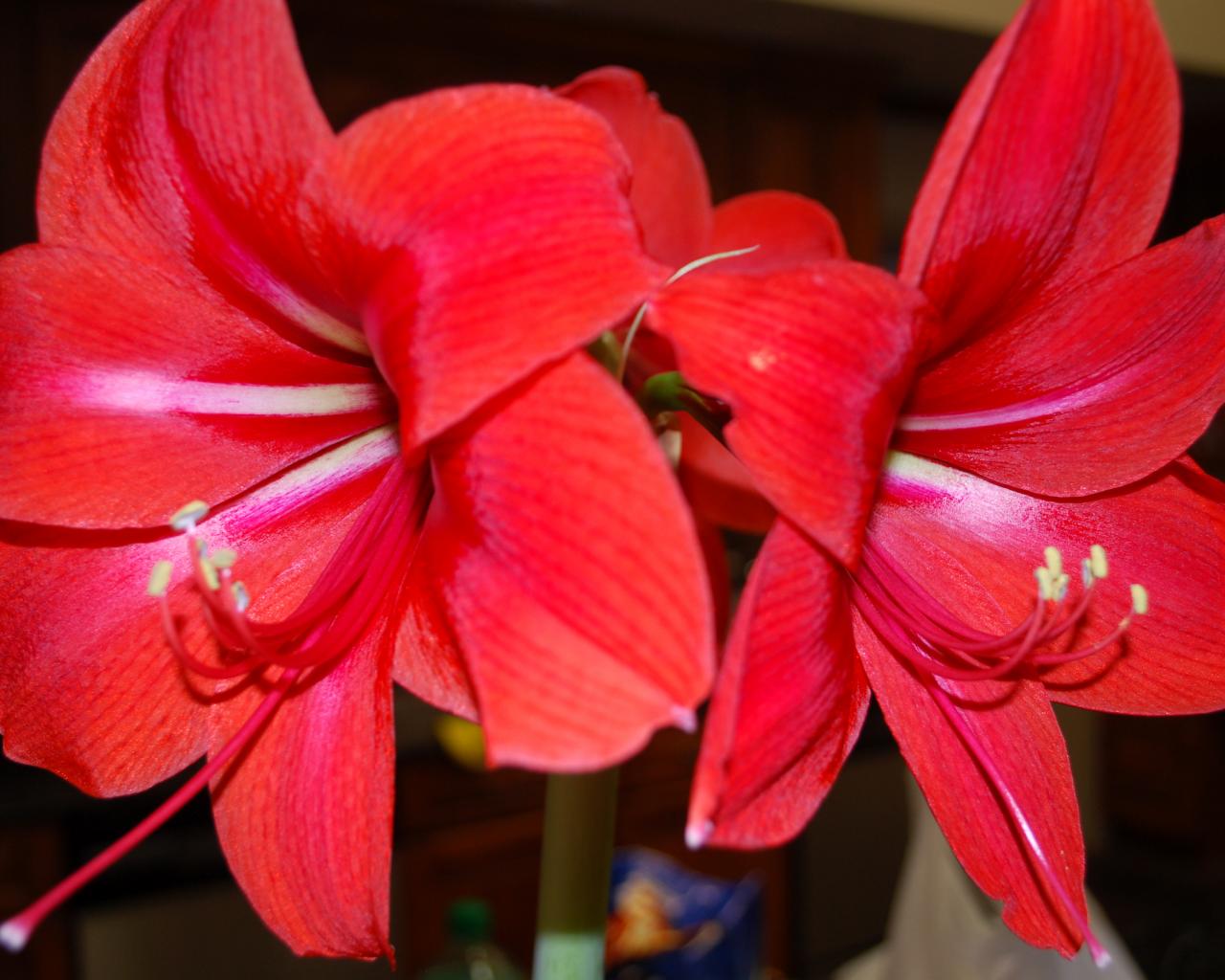 Wallpaper Two red beautiful flowers of amaryllis on a black background