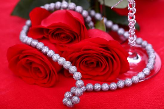 Wallpaper Three red roses with a decoration on a red background