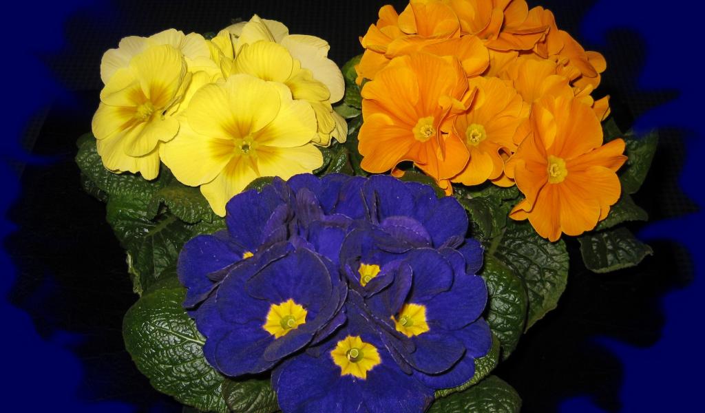 » Wallpaper Three multicolored indoor primula flower on a blue background