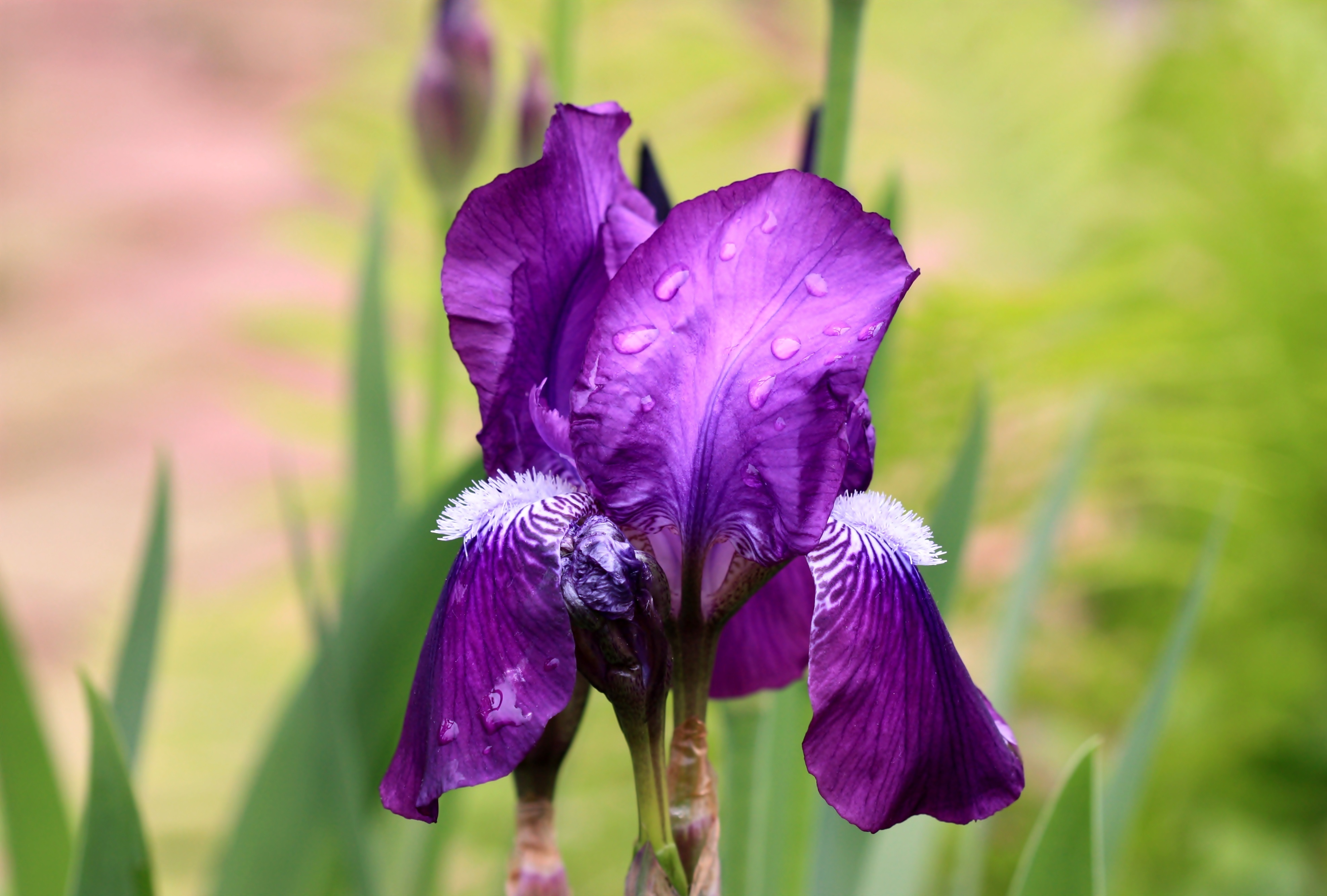 Wallpaper Violet iris flower in rain drops close-up