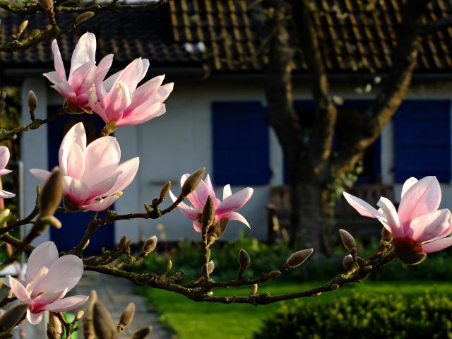 Wallpaper A beautiful short-haired woman stands by a flowering magnolia