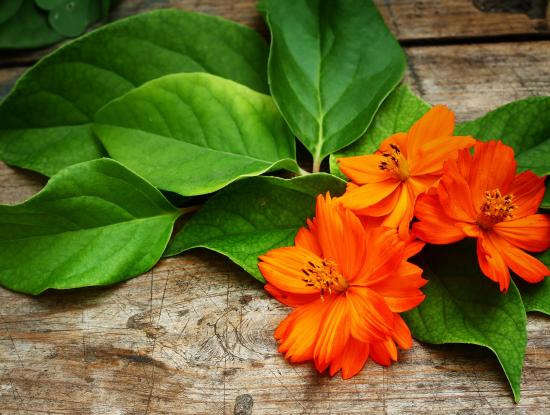 Wallpaper Large ripe pomegranate on a wooden table with green leaves