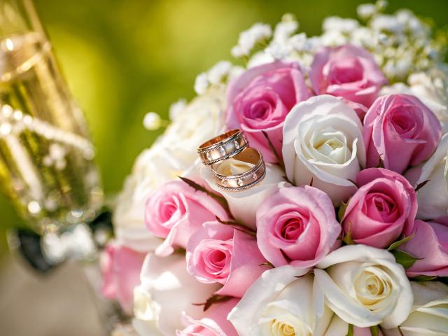Wallpaper Bouquet of pink and white roses with wedding rings